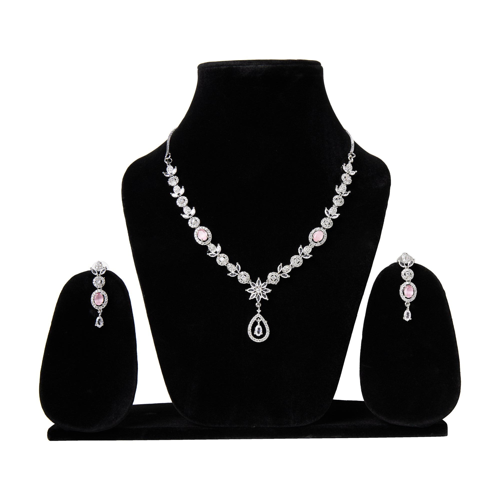Product Description : Rhodium plated American diamond Necklace jewelry set with Earrings.