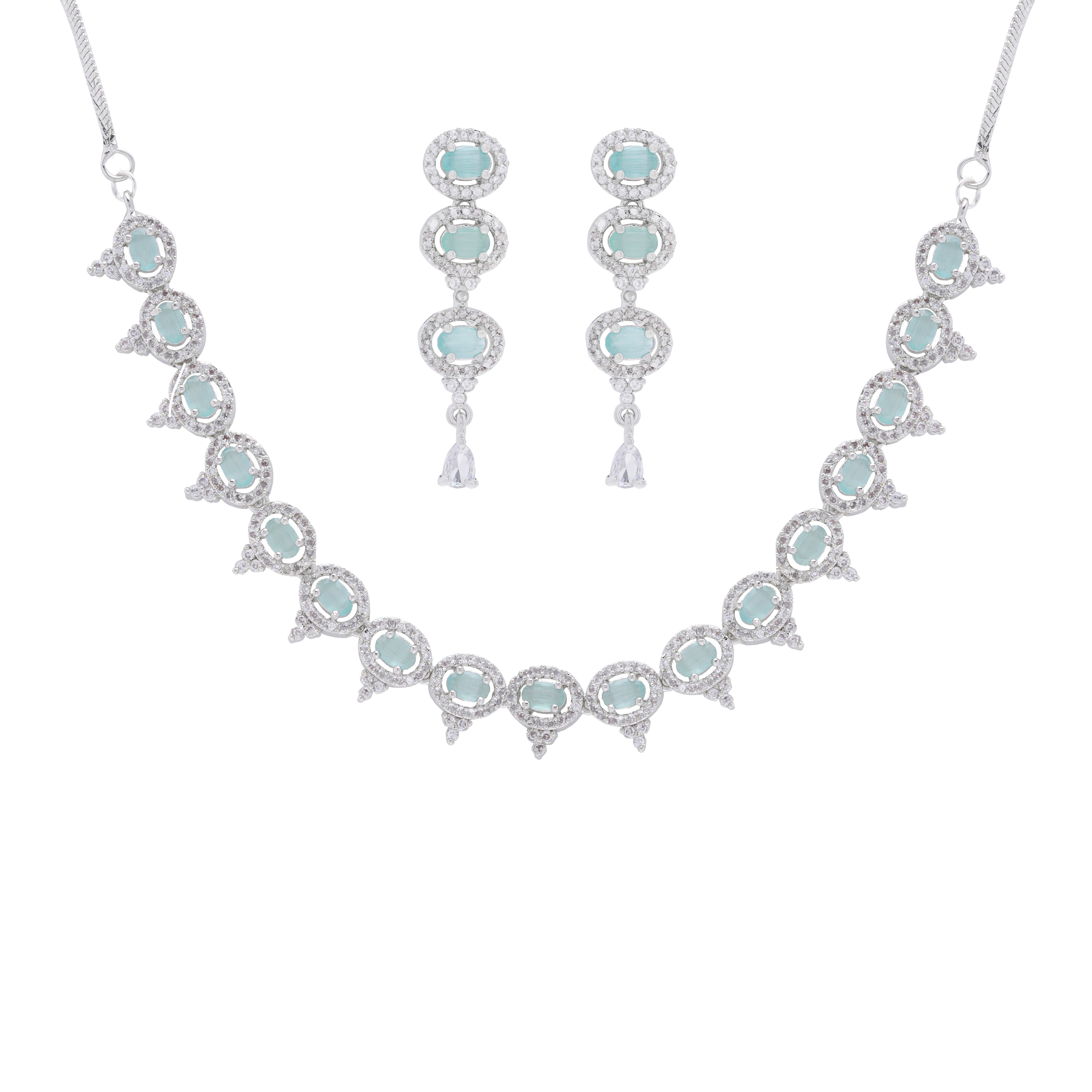 Product Description : Rhodium plated American diamond silver & green colour Necklace Jewelry set with matching Earrings