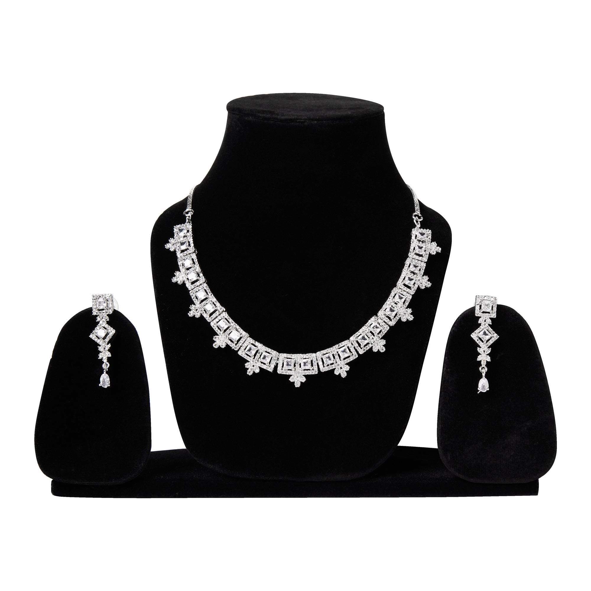 Product Description : Rhodium plated silver American diamond Necklace jewelry set with Earrings.