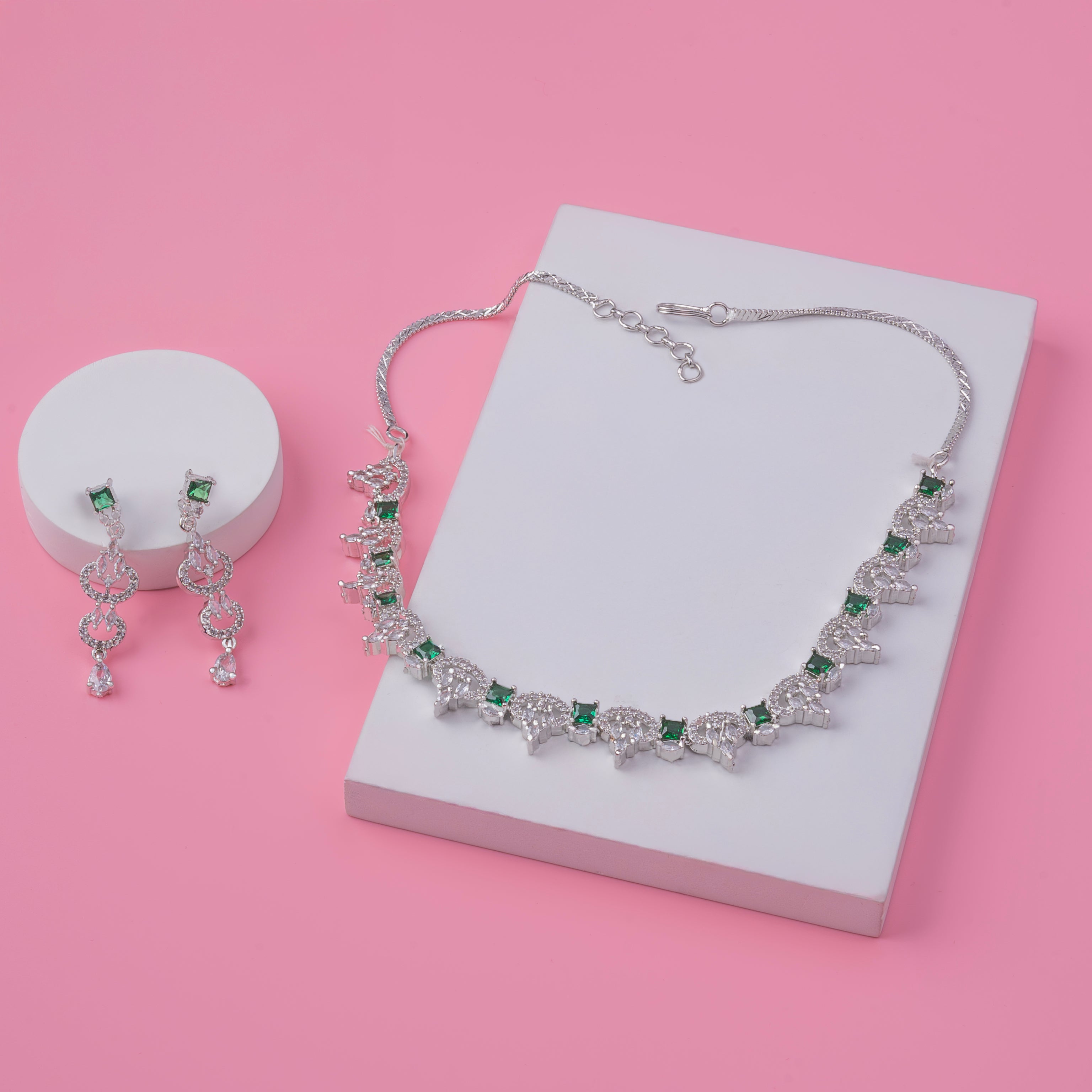 Product Description : Rhodium plated silver American diamond Necklace jewelry set with Earrings.