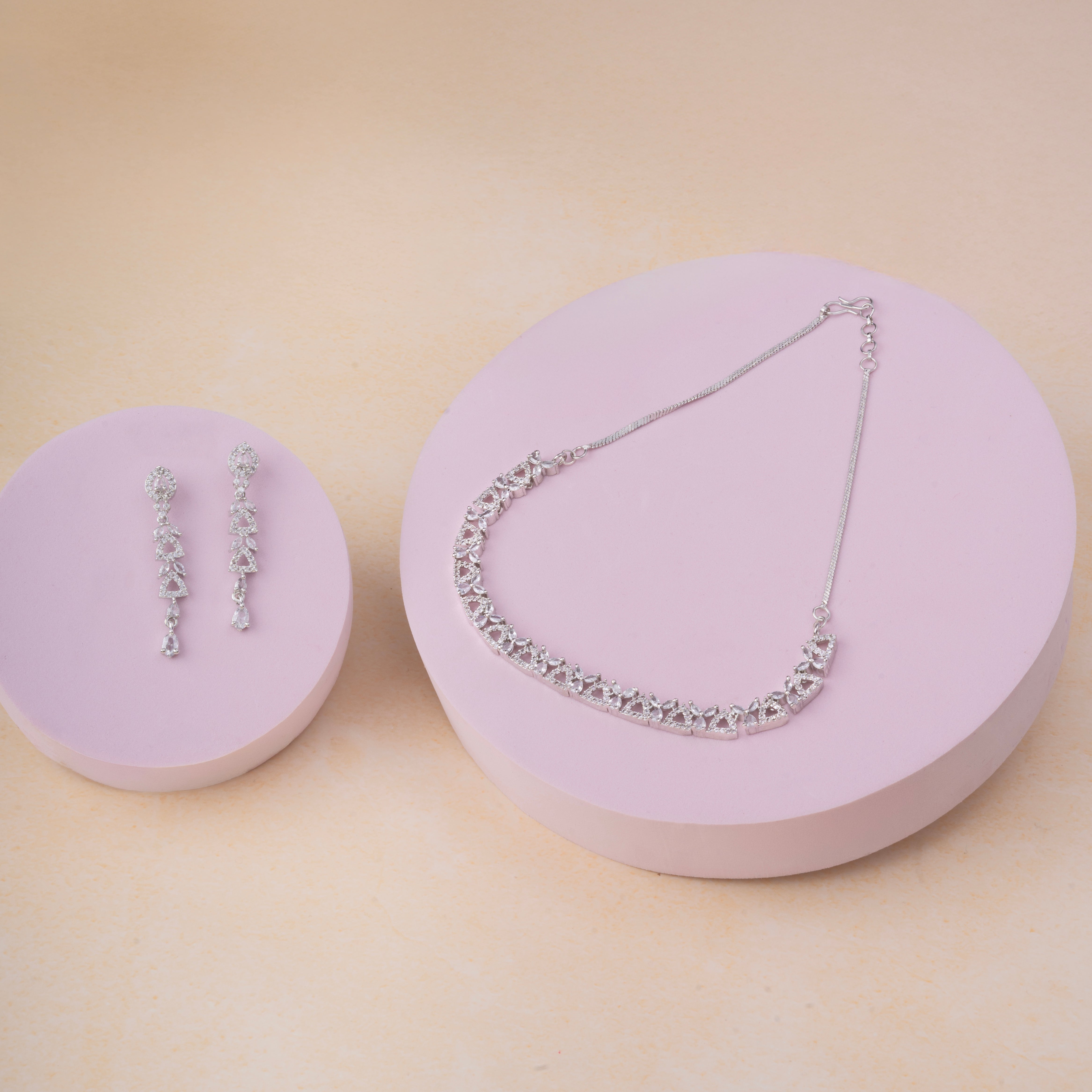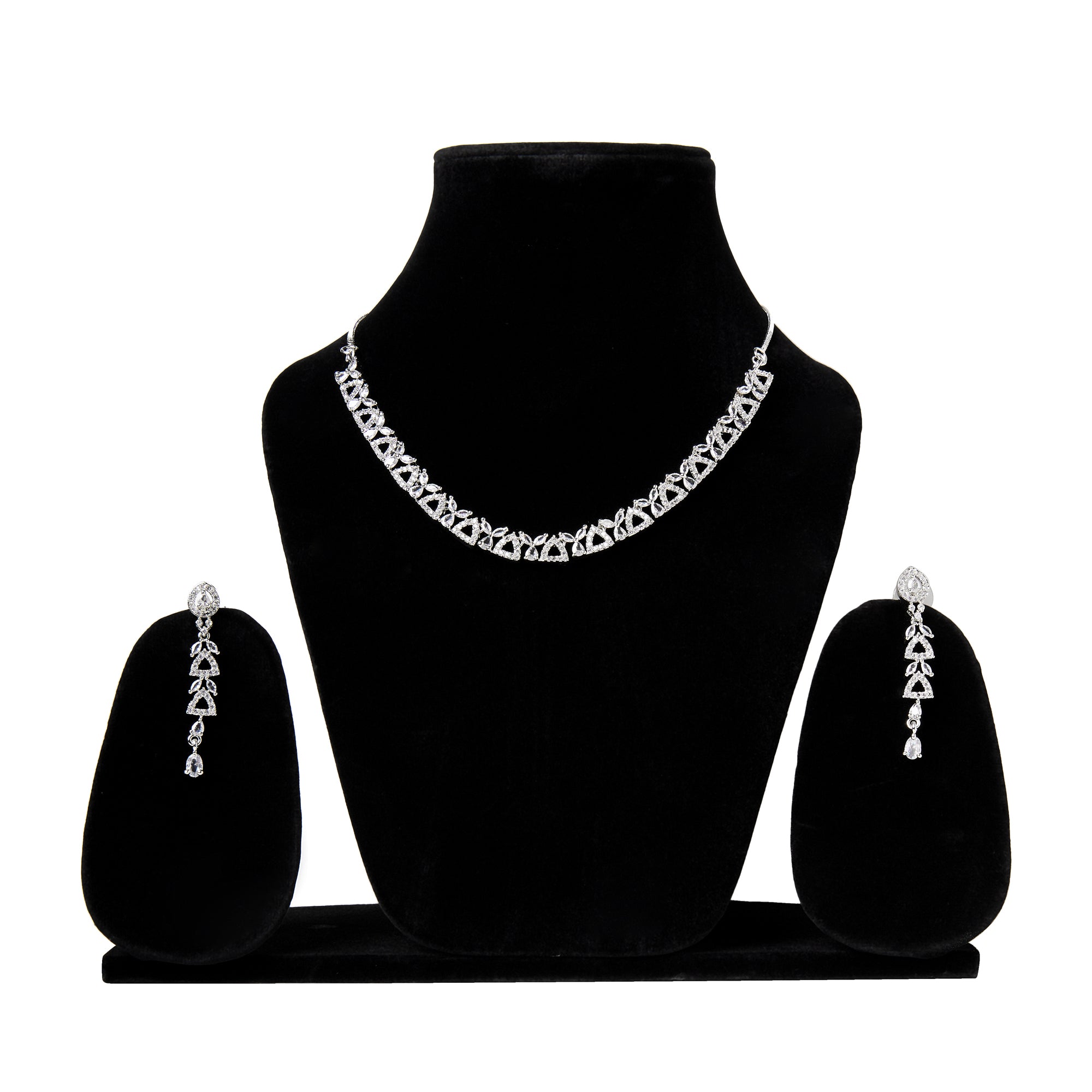 Product Description : Rhodium Plated American diamond Necklace Pendant chain jewelry set with pair of Earrings.