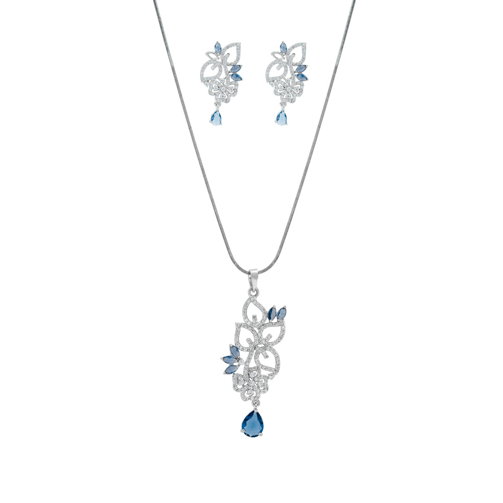 Product Description : American diamond Necklace Pendant chain jewelry set with matching blue color pair of Earrings.