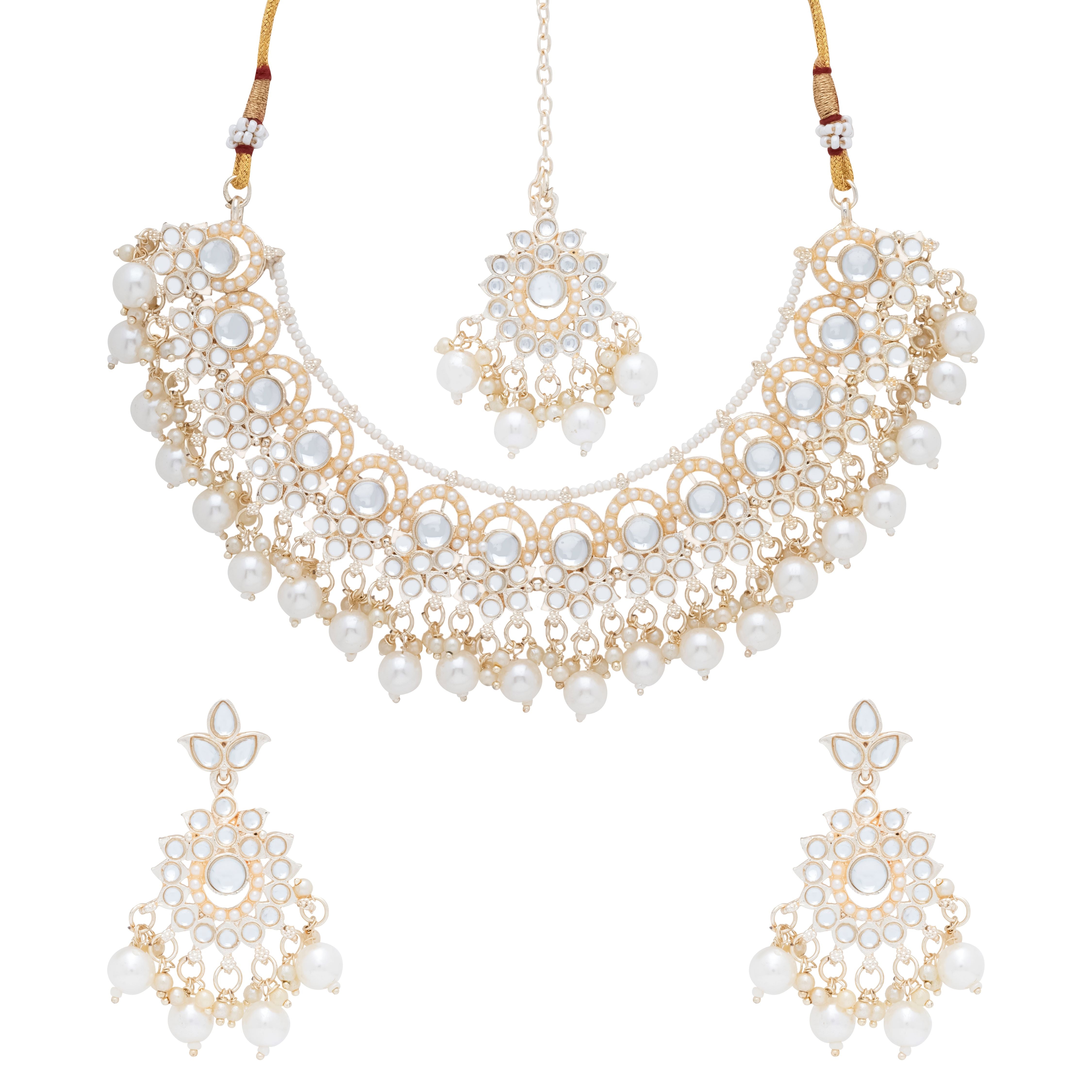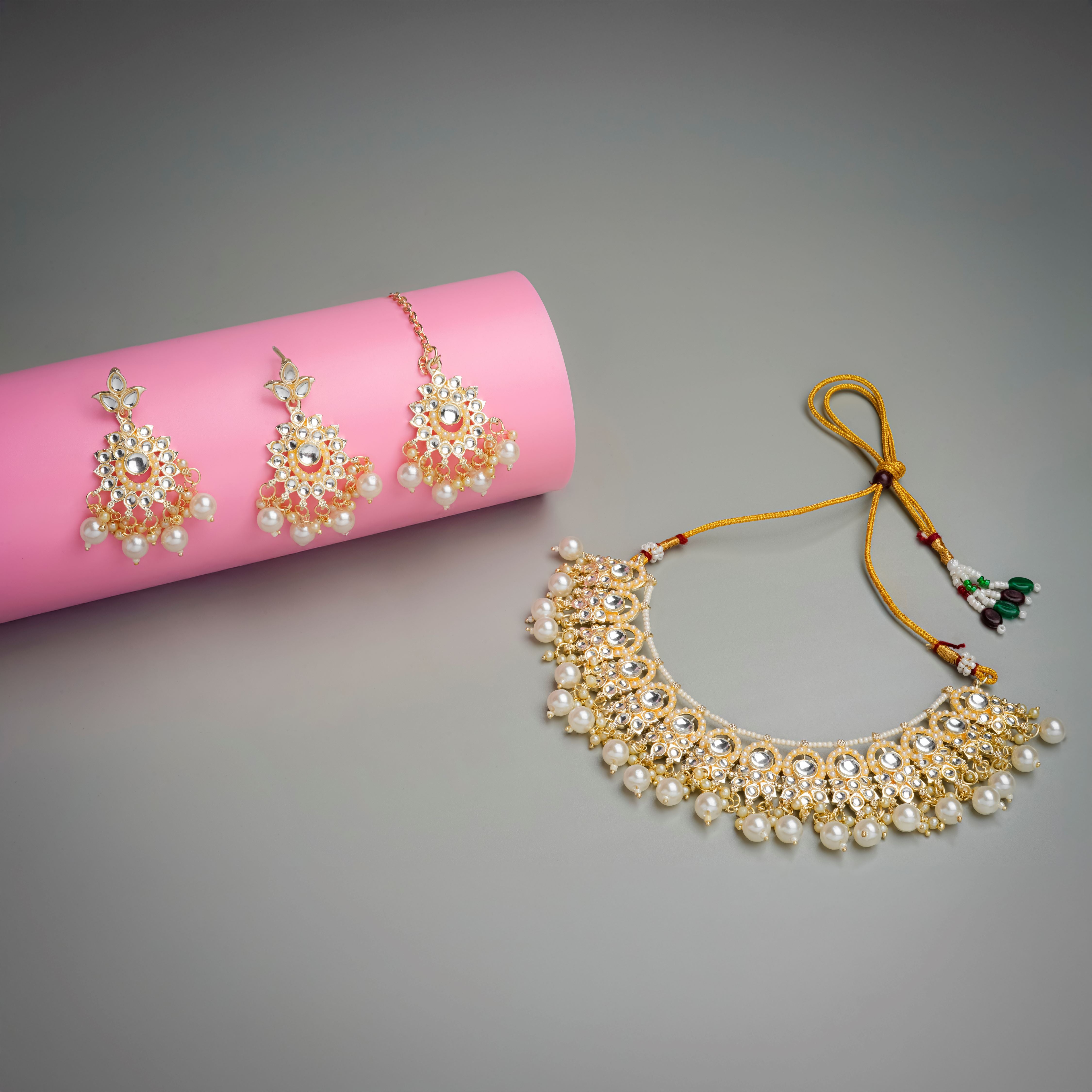 Gold Plated Kundan and Pearl Necklace Choker set for Women with Maangtika & Earrings .