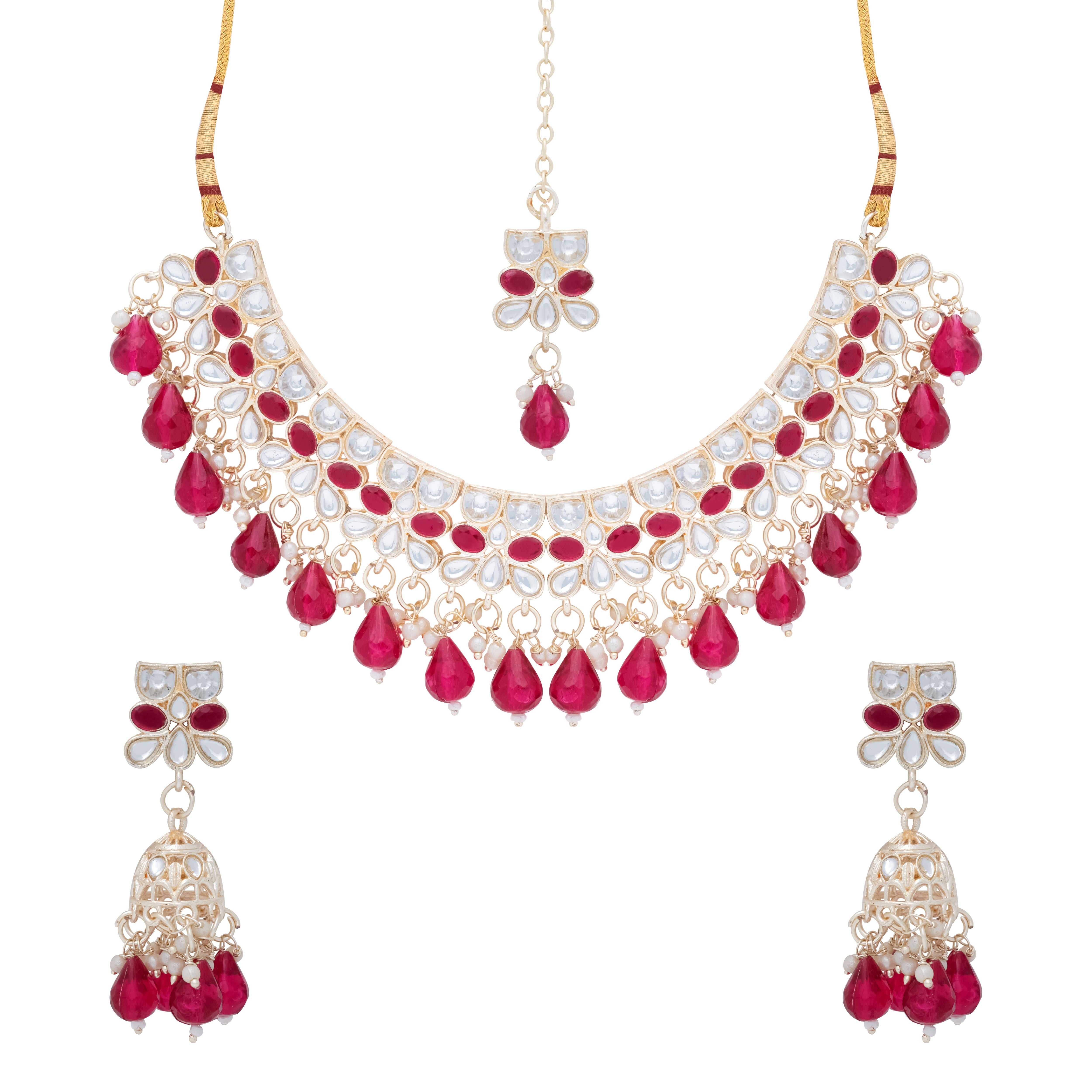 Gold Plated Kundan Stones Necklace Choker wedding Set for Women with Maangtika & Earrings .Cherry