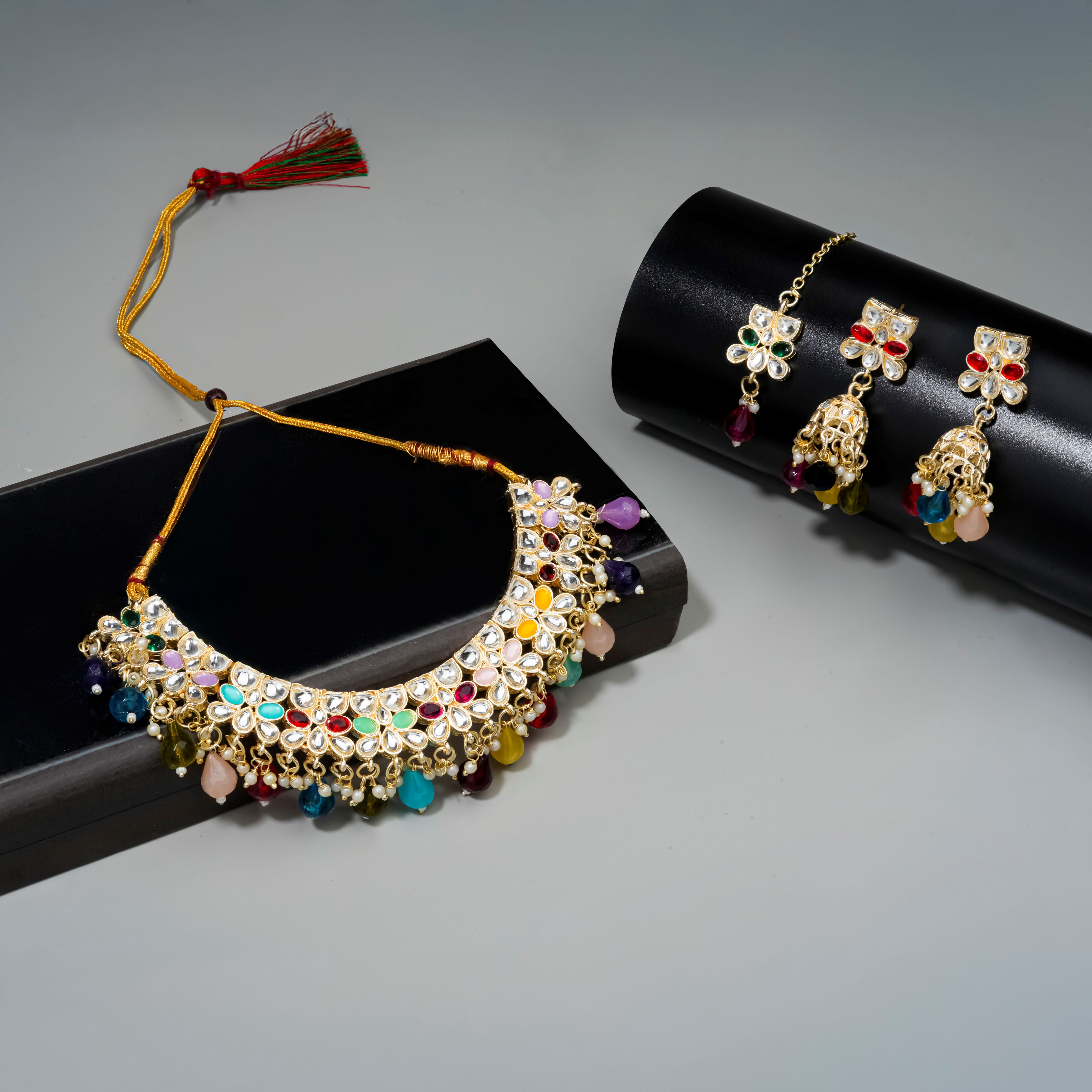Gold Plated Kundan Stones Necklace Choker wedding Set for Women with Maangtika & Earrings .multicolor