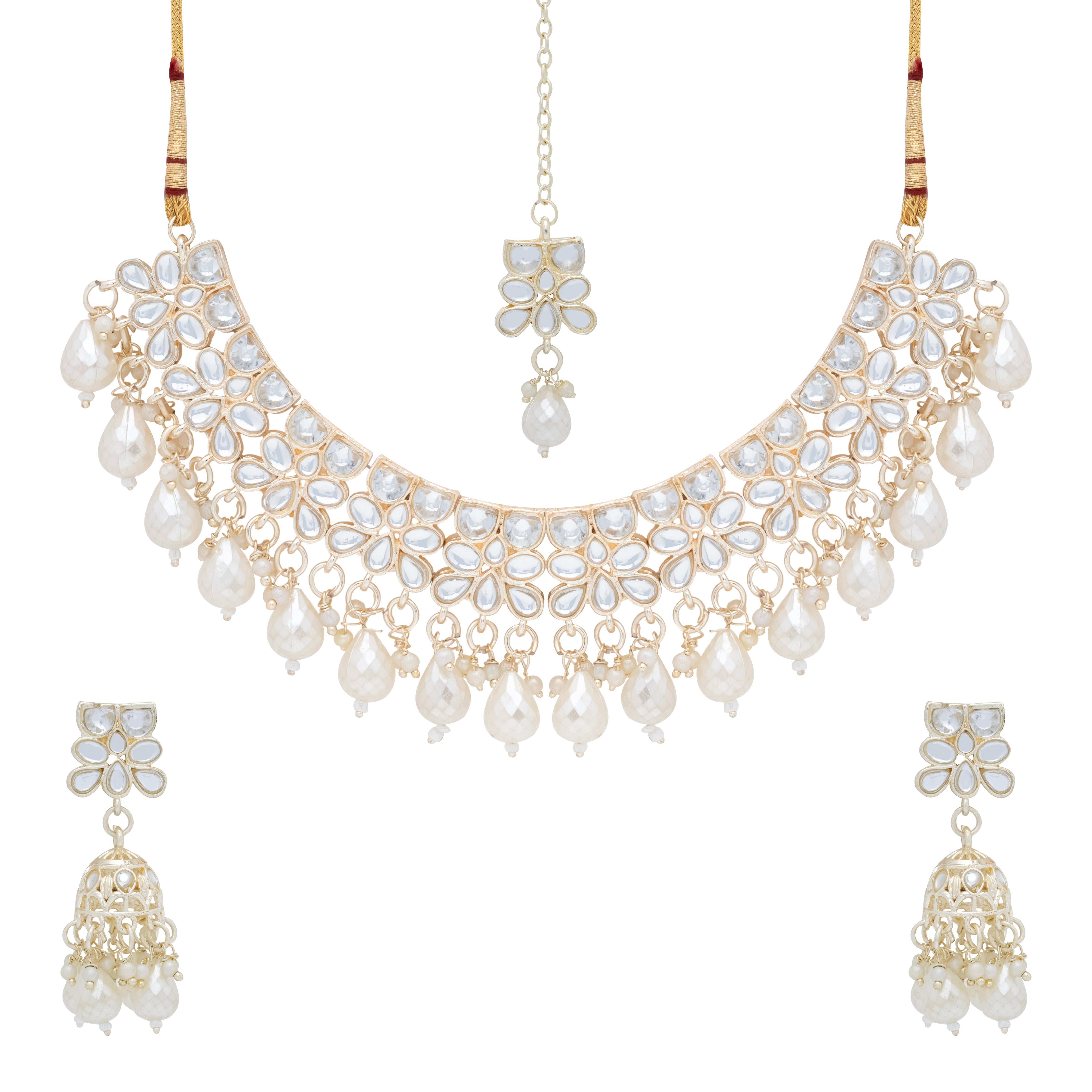 Gold Plated Kundan Stones Necklace Choker wedding Set for Women with Maangtika & Earrings .Off white