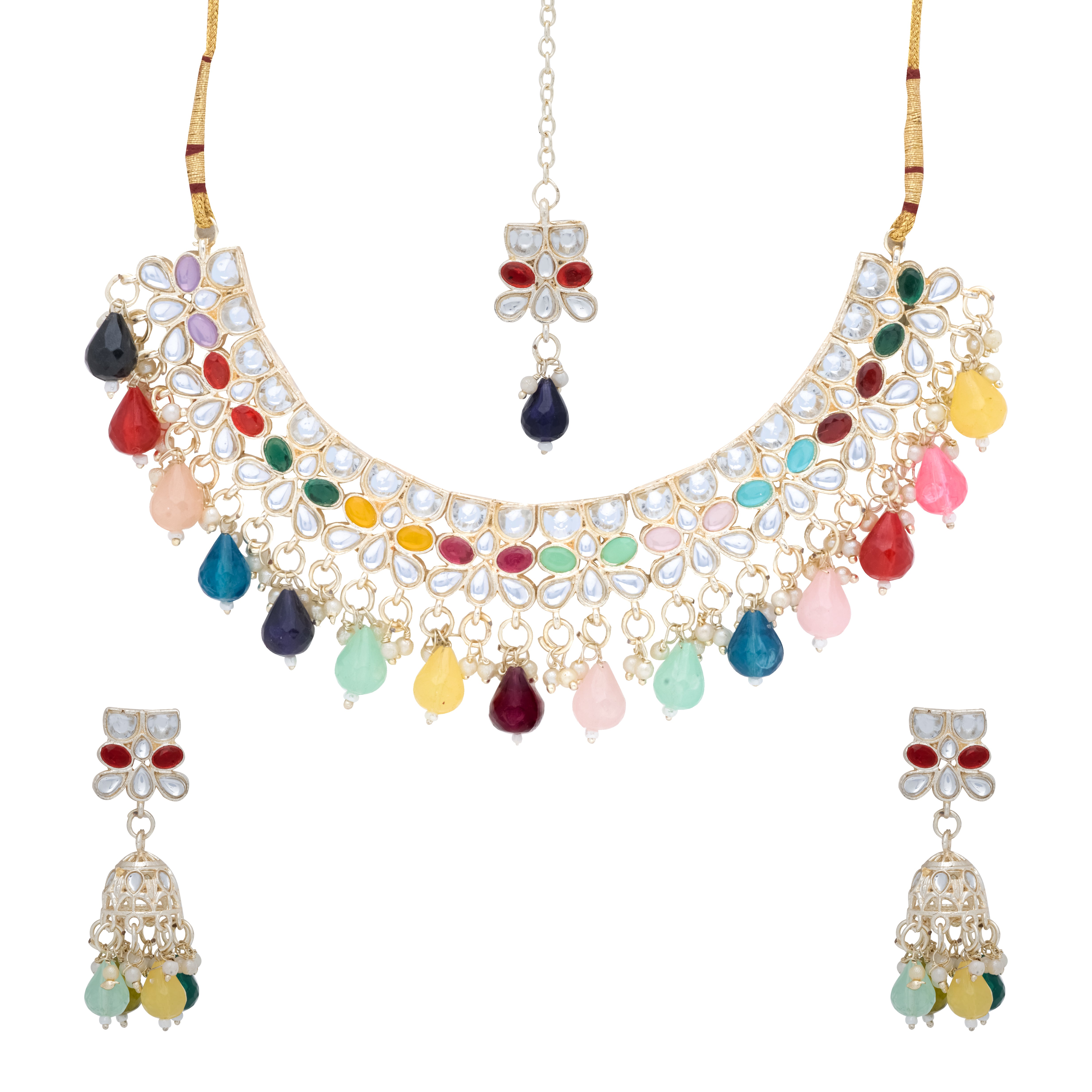Product Description : Gold Plated Kundan Stones Necklace Choker wedding Set for Women with Maangtika & Earrings