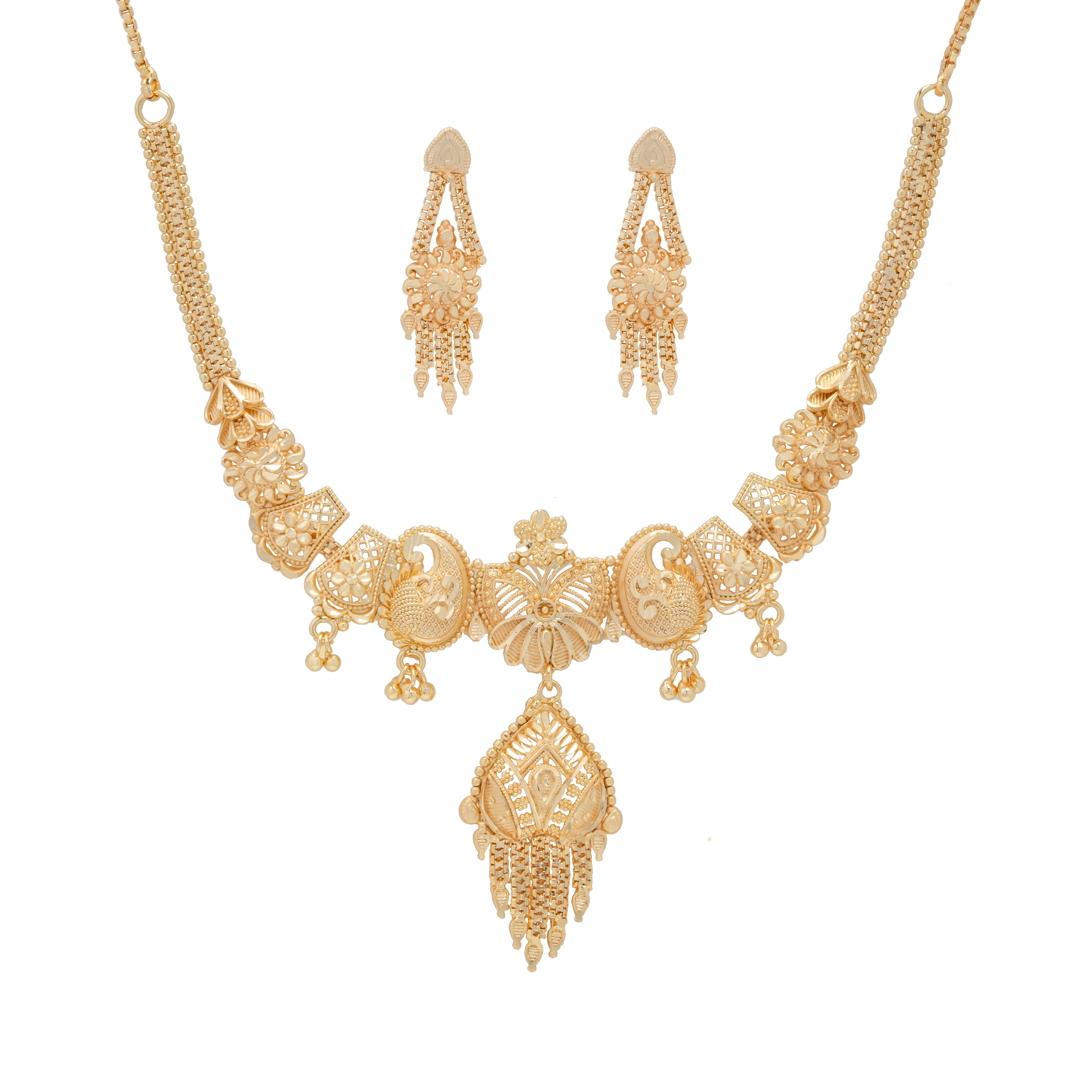 Product Description : Gold Plated Necklace jewelry set with Earring for Women & girls. One gram Gold forming Bridal & wedding Jewellery set