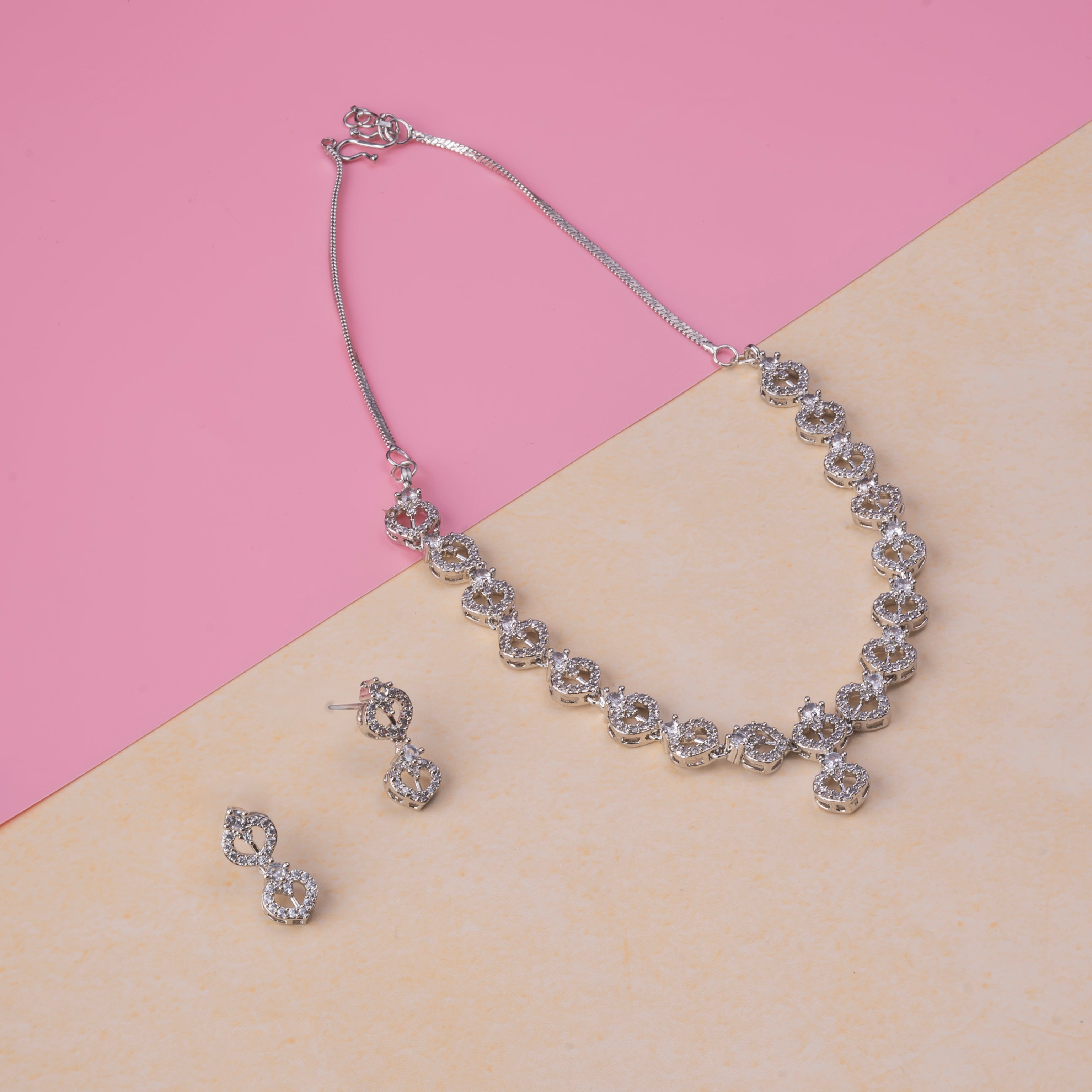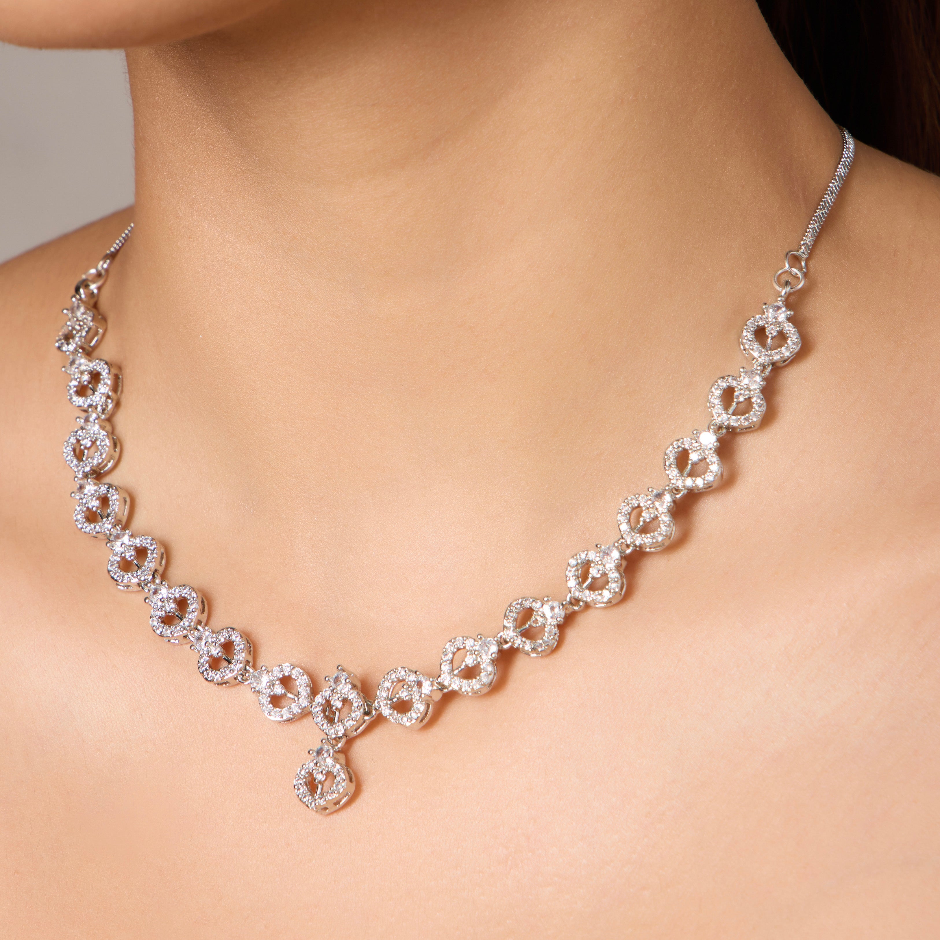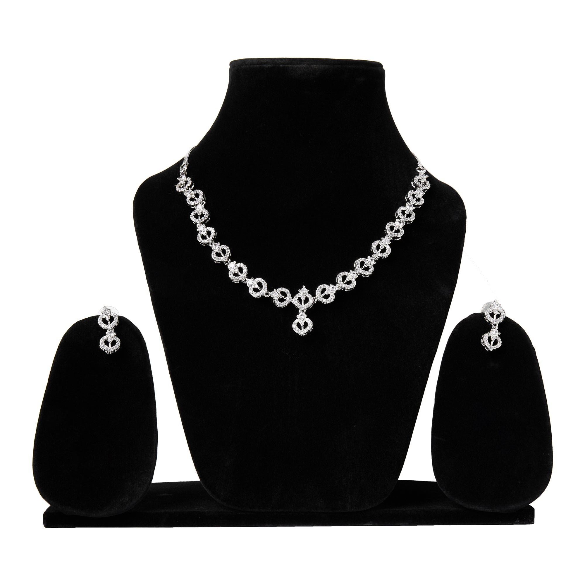 Product Description : Rhodium Plated American diamond Necklace Pendant chain jewelry set with pair of Earrings.