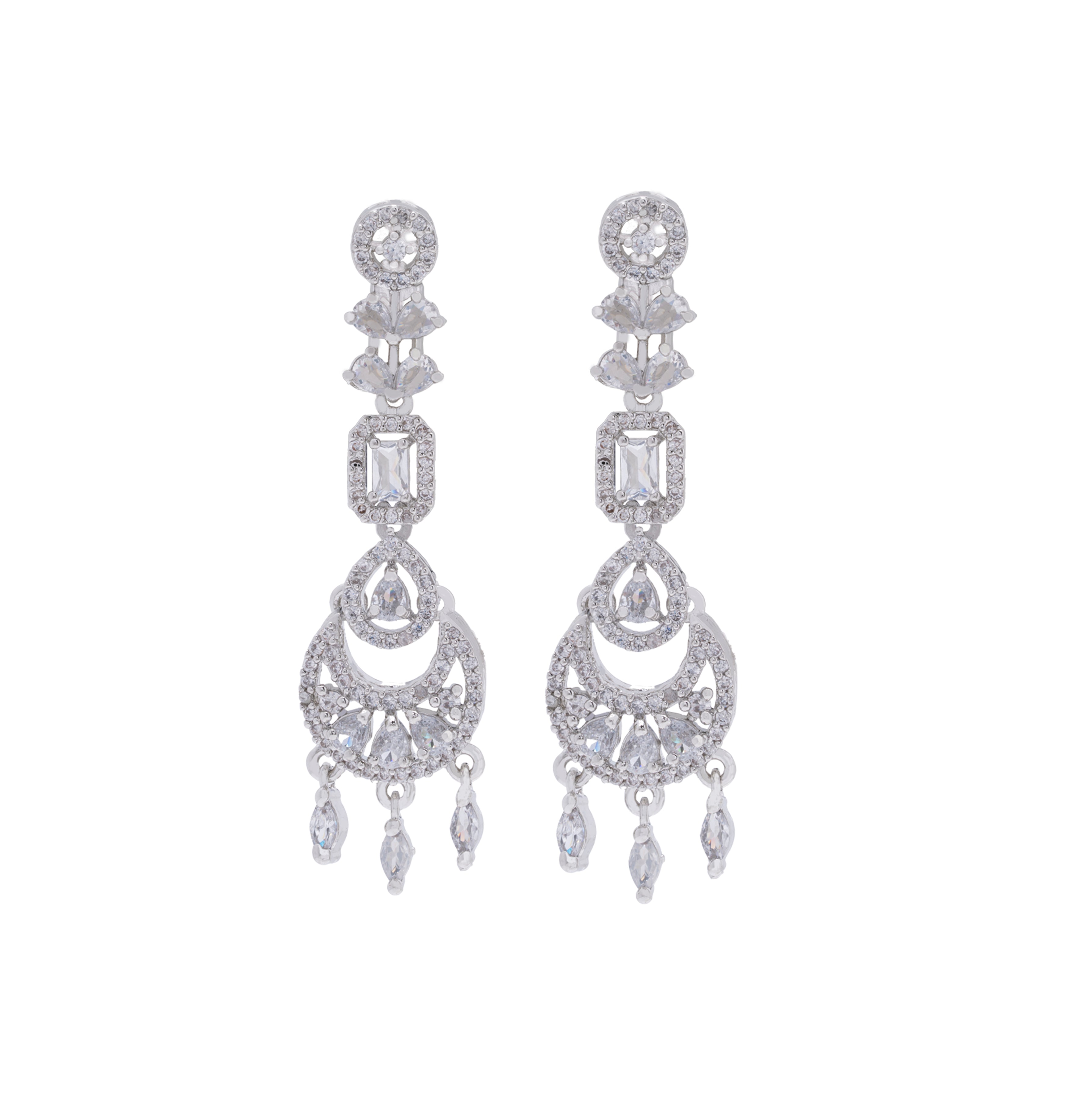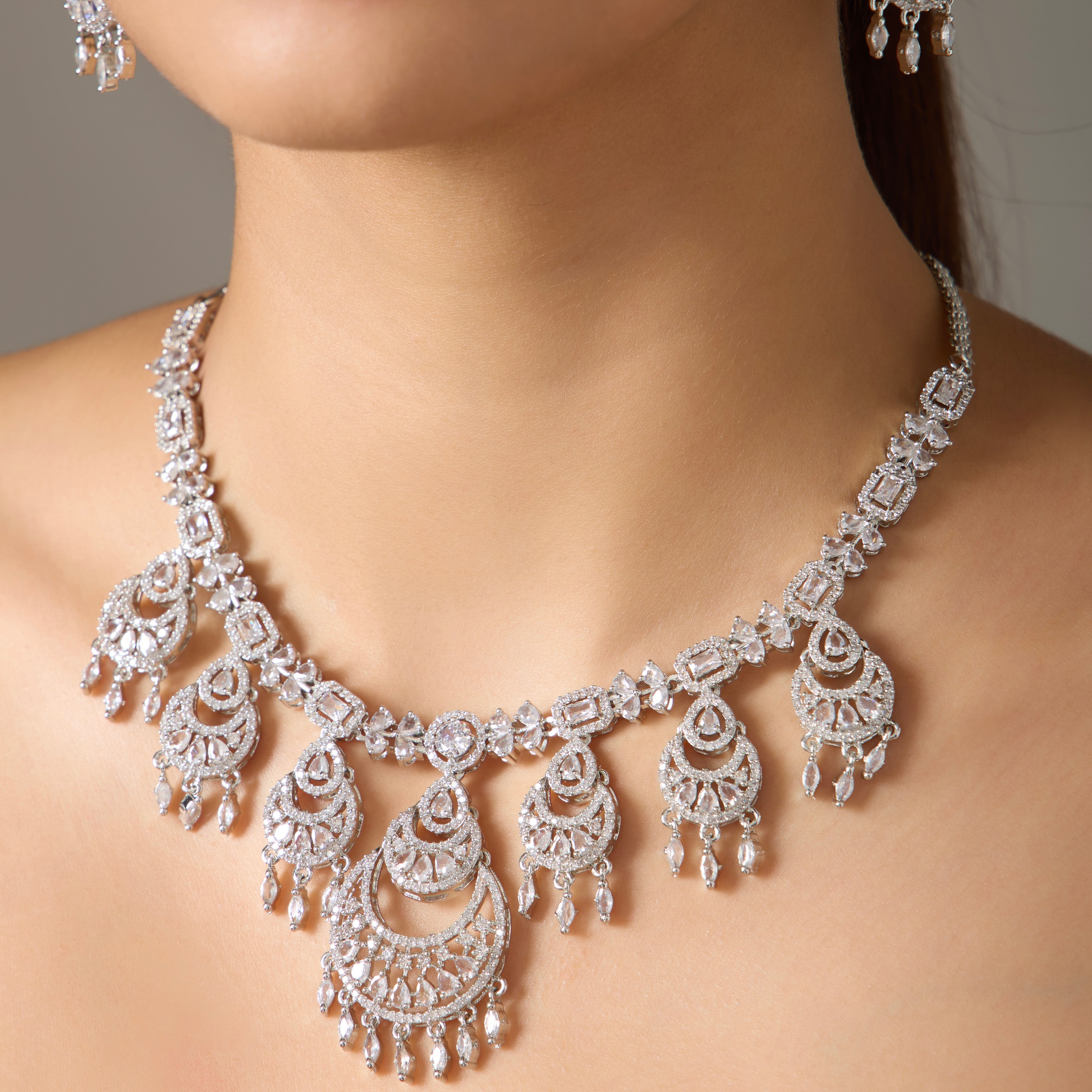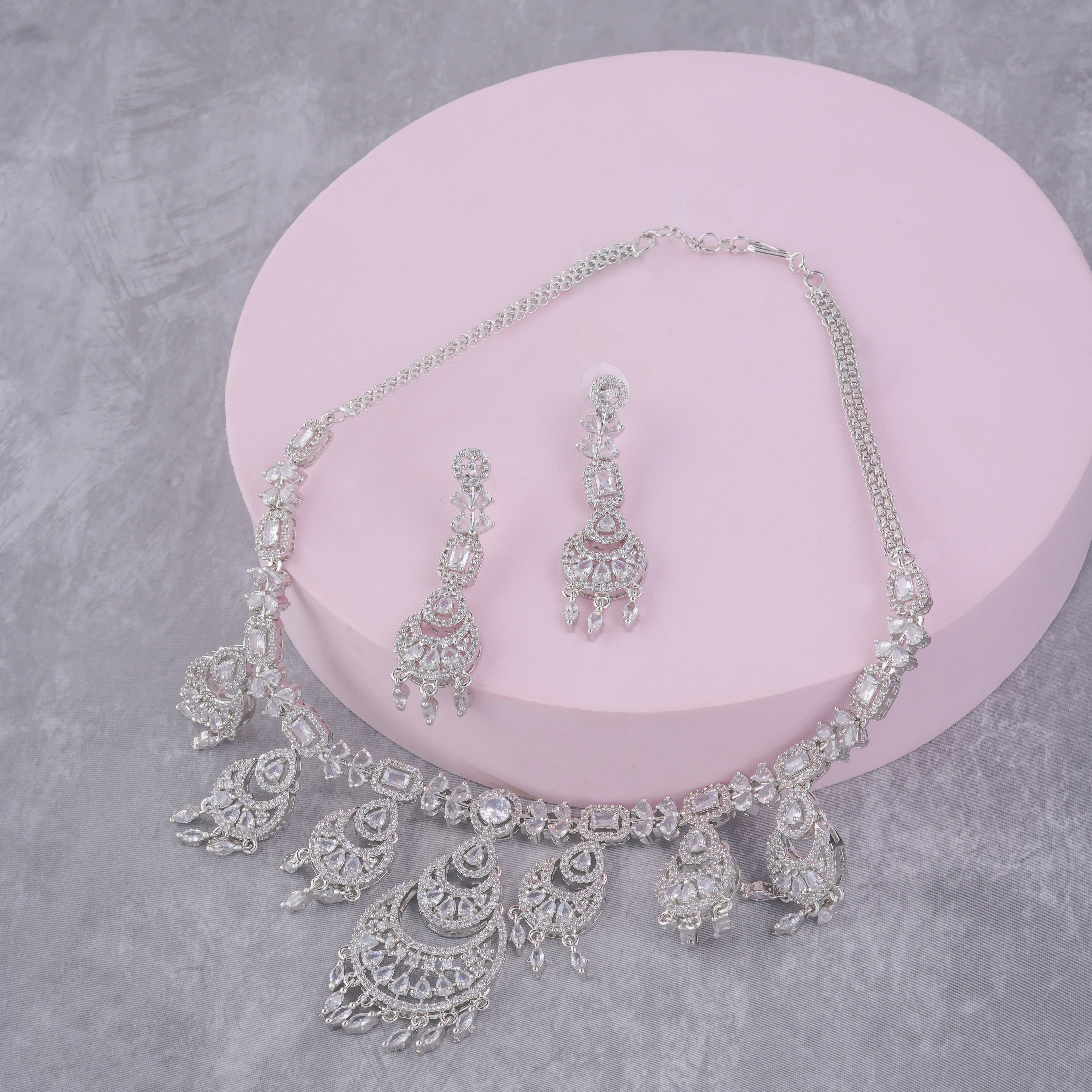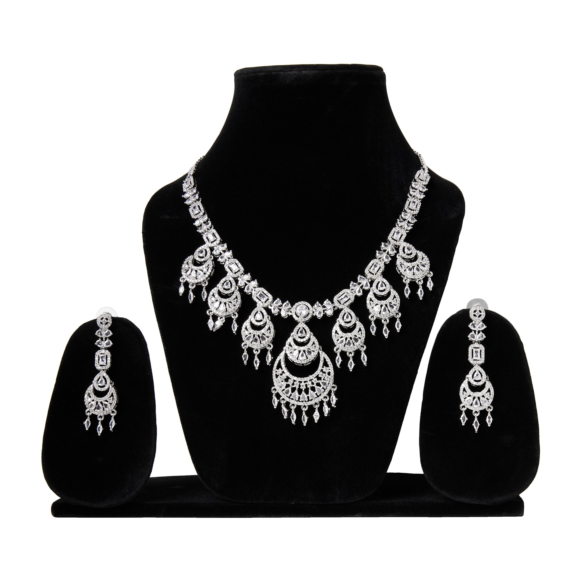 Product Description : Rhodium plated silver American diamond Necklace jewelry set with trending matching Earrings.