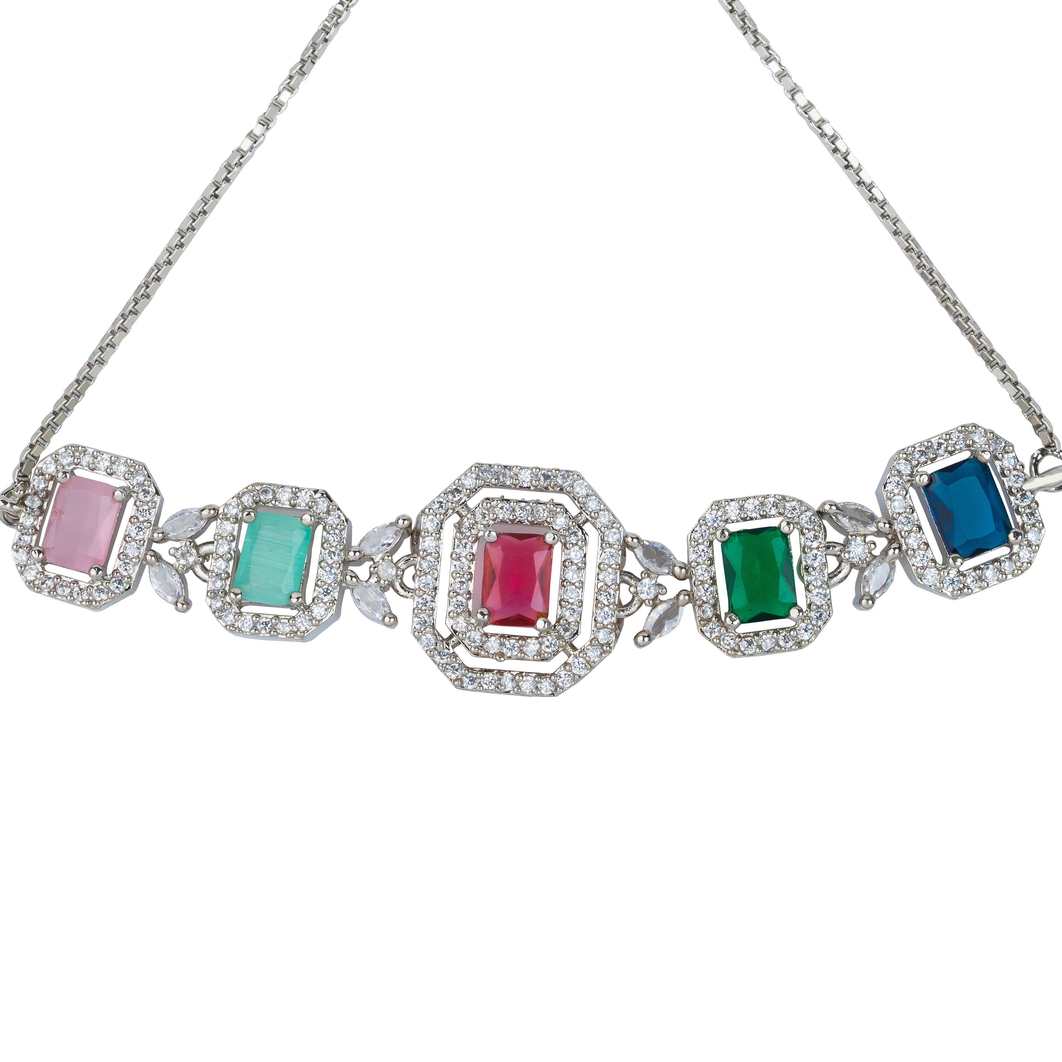 Product Description : Rhodium plated American diamond CZ Bracelet jewellery set for women. Silver-toned and white charm bracelet.