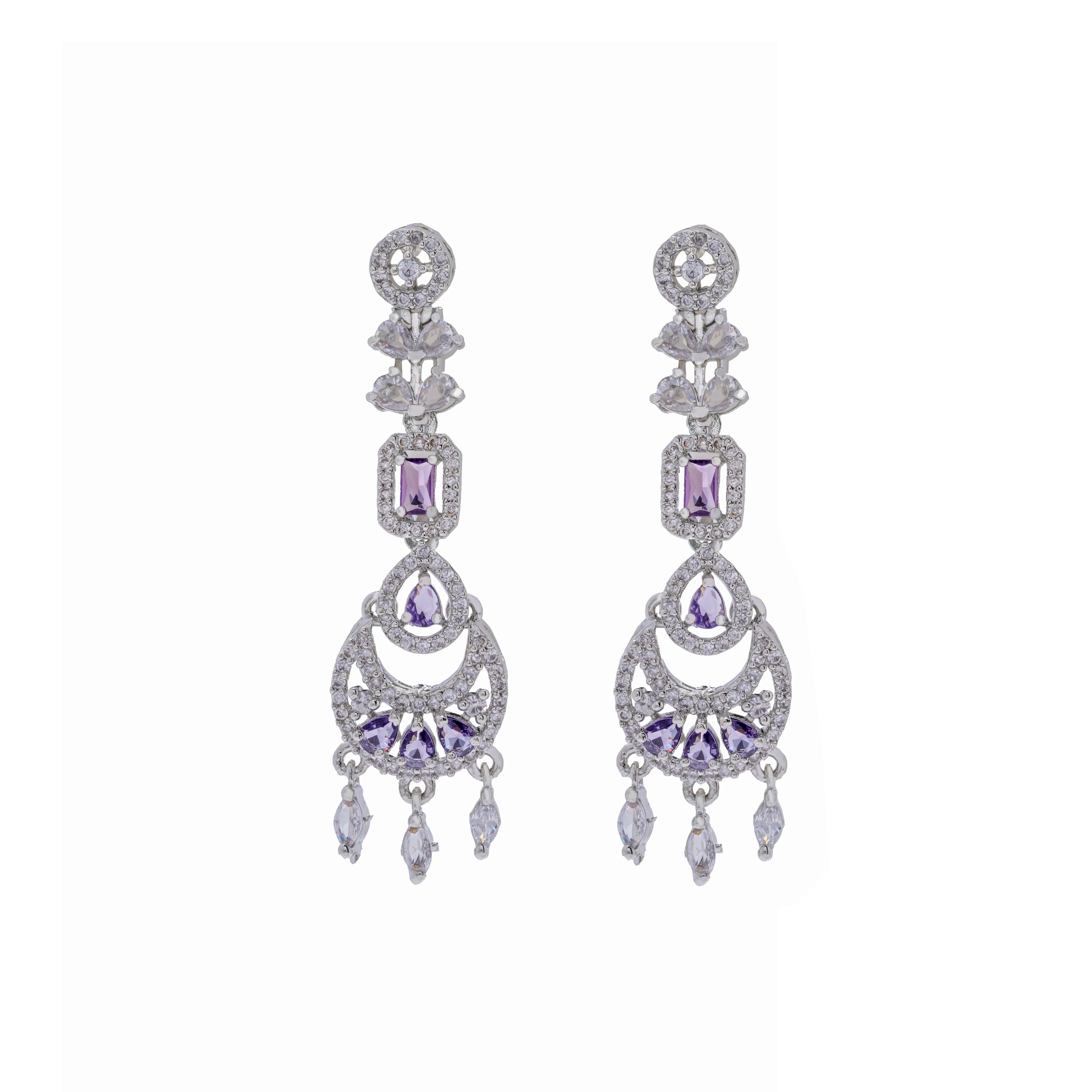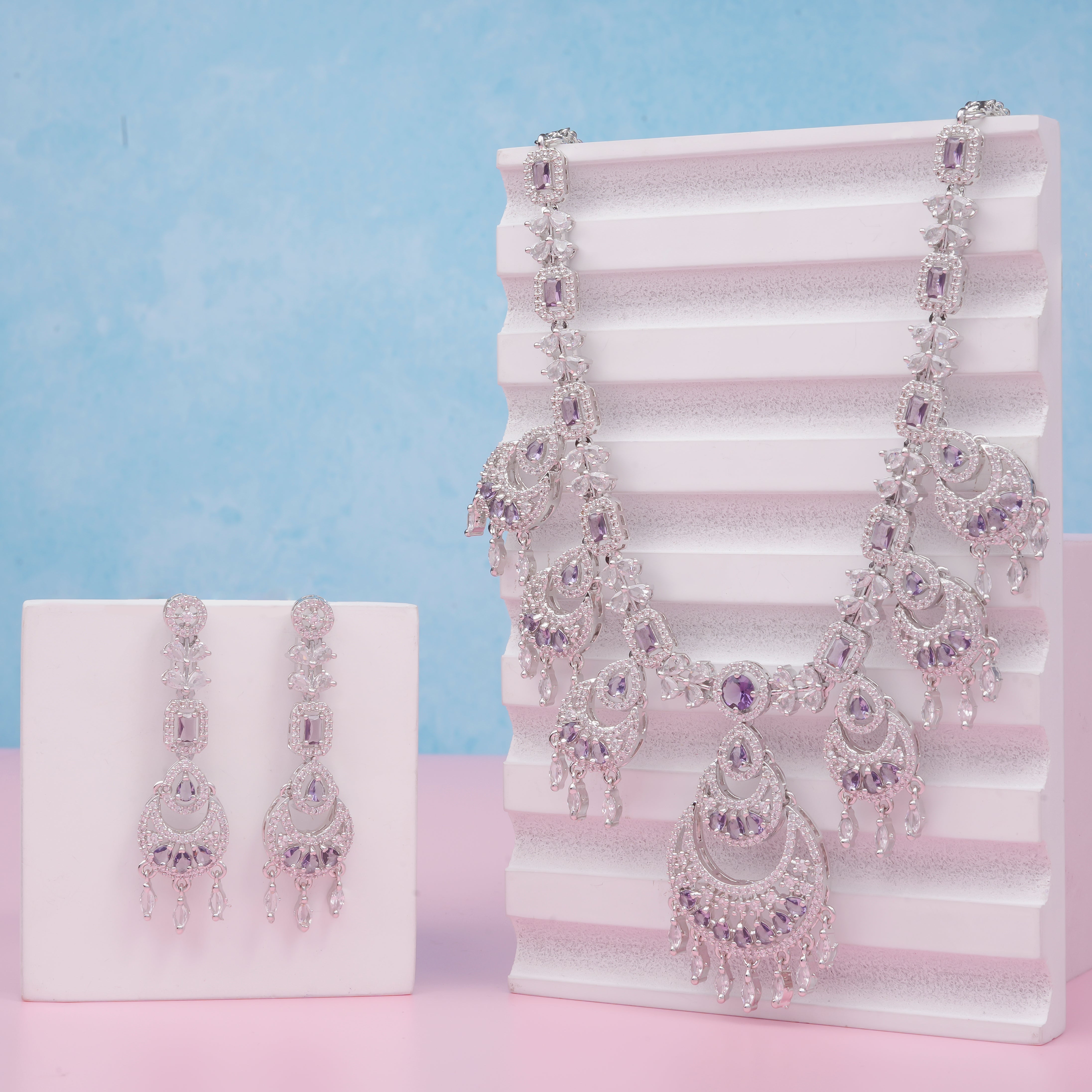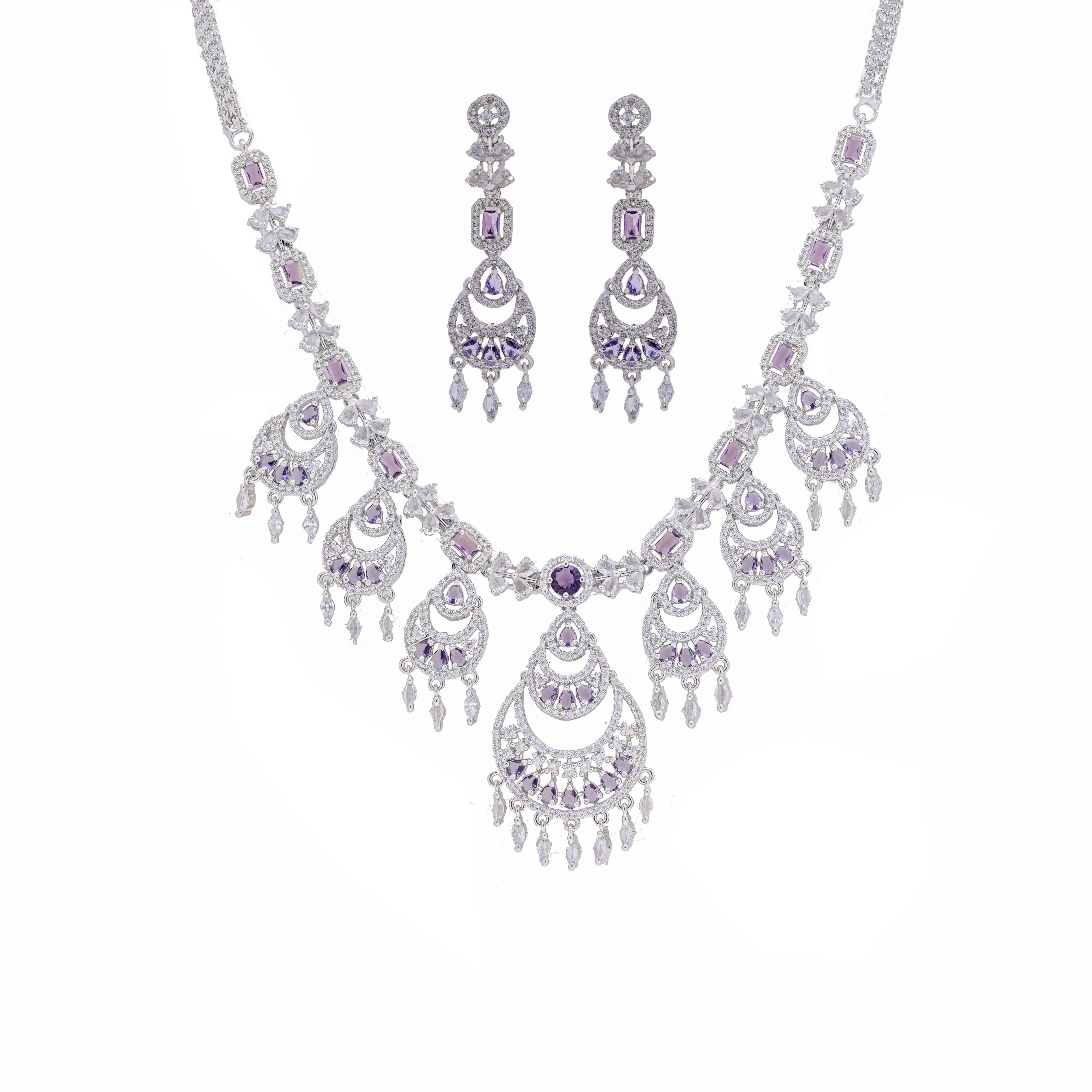 Product Description : Rhodium plated American diamond Necklace jewelry set with trending matching Earrings.
