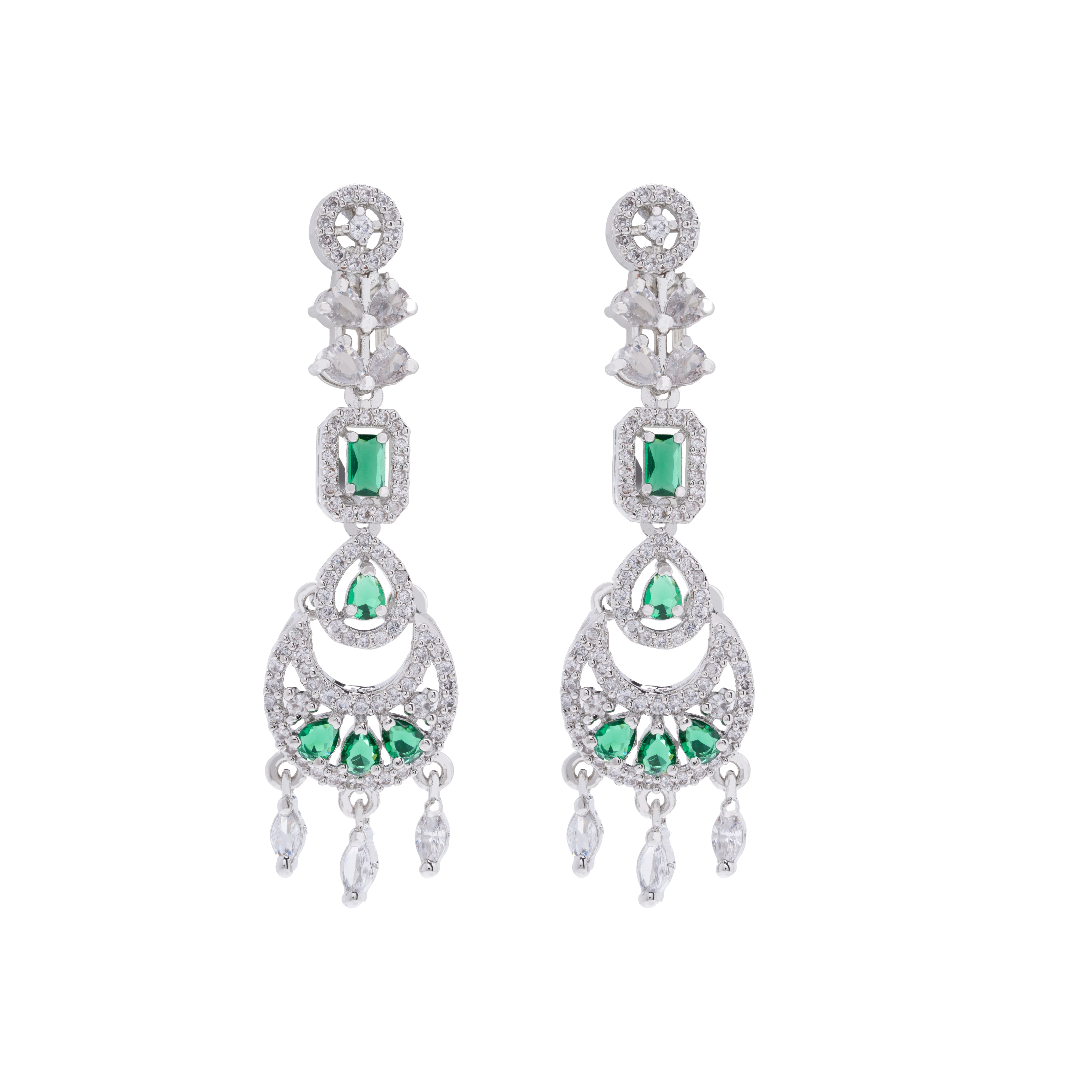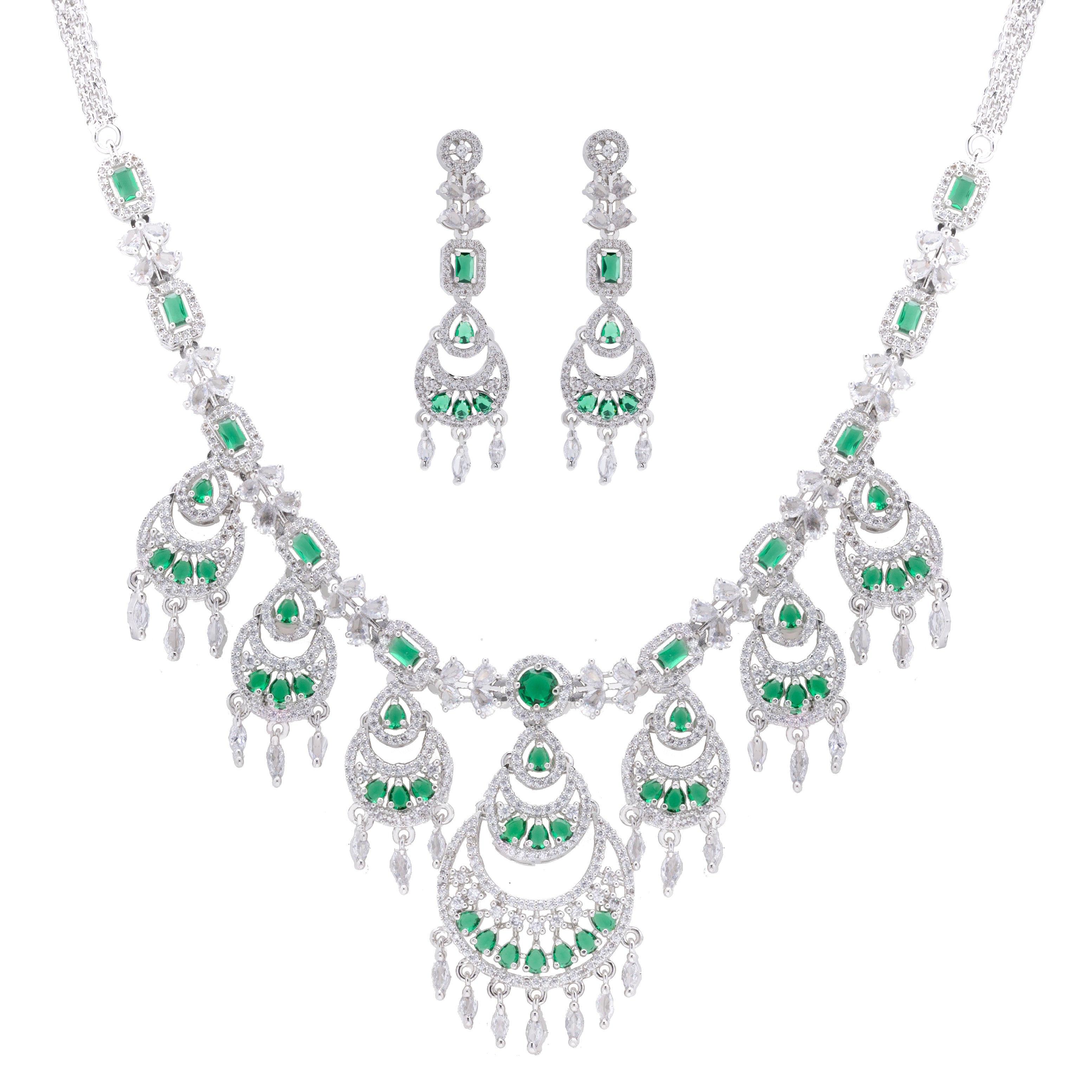 Rhodium Plated American Diamond Necklace Jewelry wedding bridal set with matching Earrings for women . Green color Wedding Neckpiece gift for Girls
