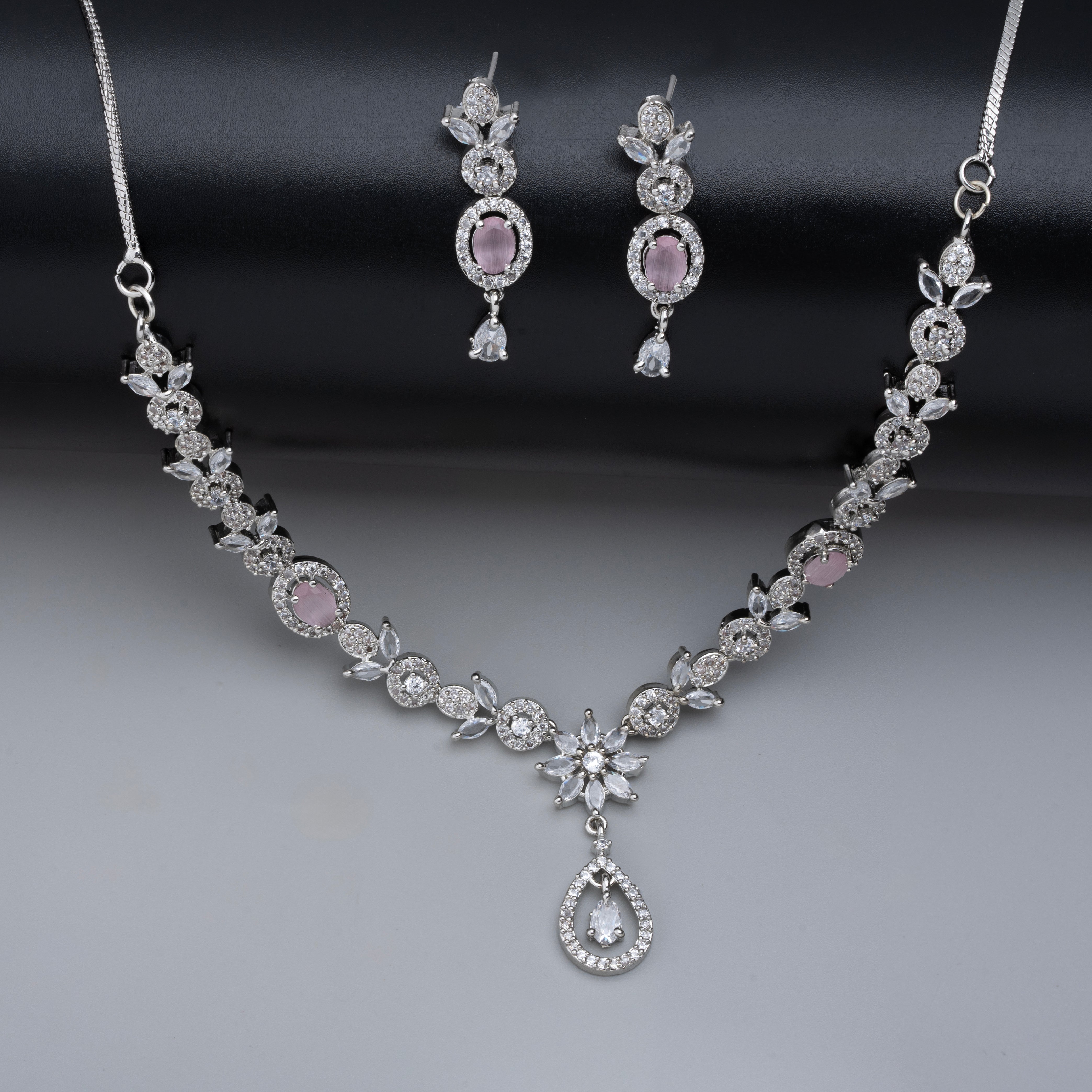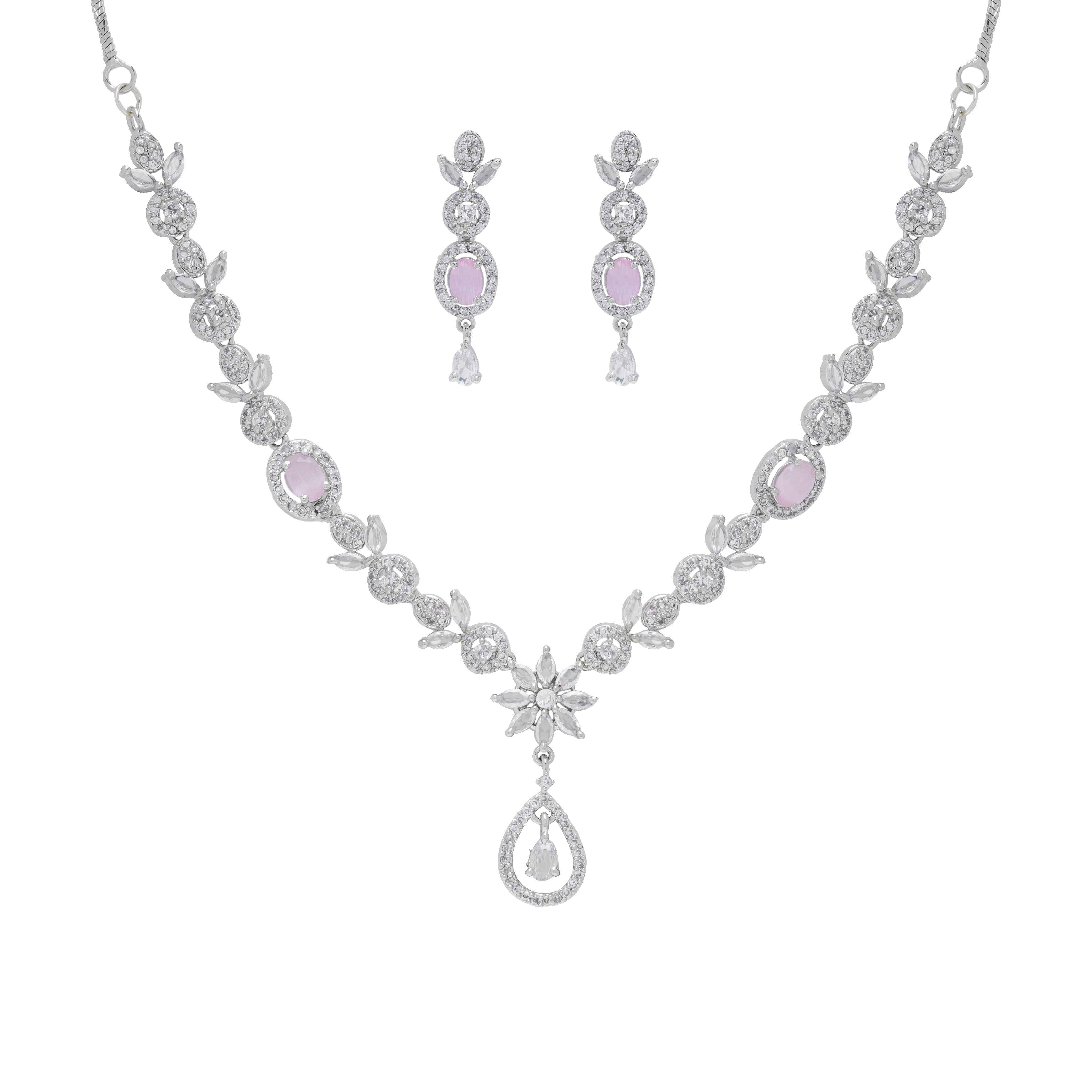 Product Description : Rhodium plated silver American diamond Necklace jewelry set with trending matching Earrings.
